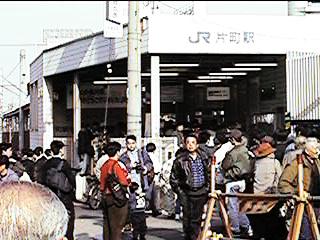 左・JR片町駅周辺とごったがえす人々。