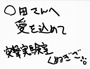 八王子の日。えー、八王子の某社の社員が当サイトのコンテンツを閲覧することは厳禁となっております。社内ネットワークから見るなど以ての外。ブックマークおよびお気に入りへの登録といった行為も厳しく取り締まっておりますので、万が一発覚すれば、原因不明のディスククラッシュが発生することになるかも知れません。当然のことながら、いわゆるファン行為なんて論外。なのに、サインが欲しいなんて言ったのは本当ですか、○田さん。弘法大師ですら恐れおののく達筆さゆえ、自筆の文字だけは絶対に晒せないと思っていたのですが、とうとうやってしまいました。家宝にしてください、というか、する義務があります、○田さん。